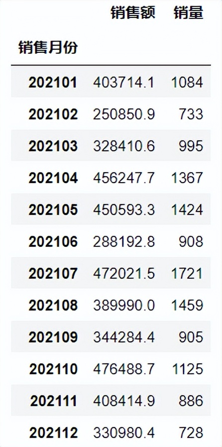 计算每月的销售额、销售数据情况,使用groupby函数,同时aggregate函数自定义数值的计算方式,数据结果如下。