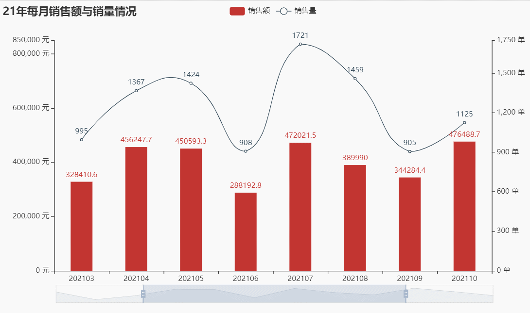 .set_global_opts(title_opts=opts.TitleOpts(title="21年每月销售额与销量情况"),