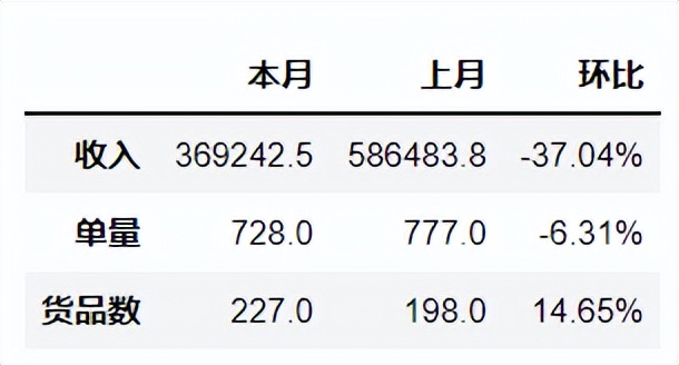 shouru2,danliang2,huopin2=get_month_data(last_month)#计算上月数据指标