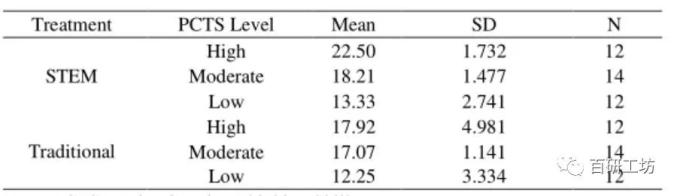 STEM班学生的创造性思维能力分为高、中、低三个水平,连续三个水平的平均水平分别为22.50、18.21、13.00,连续三个水平的标准差分别为1.732、1.477和2.741。在传统课堂上,高、中、低水平学生的平均创造性思维能力分别为17.92、17.07、12.25。从上到下三个层次的标准差分别为4.981、1.141和3.334。STEM班和传统班两个班的综合平均值为18.03,标准差为4.188。在这项研究中,创造性思维技能的值范围是0到30。因此,STEM班和传统班学生的平均创造性思维能力被纳入中等标准。