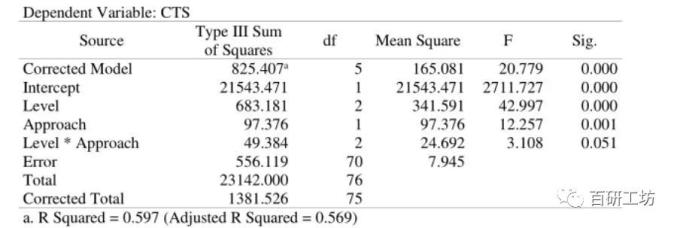 采用双向方差分析(ANOVA)检验STEM教育方式对学生创造性思维能力的影响。使用SPSS软件进行测试的结果如表2所示:https://imagepphcloud.thepaper.cn/pph/image/169/81/302.jpg图2 测试被试之间的效果