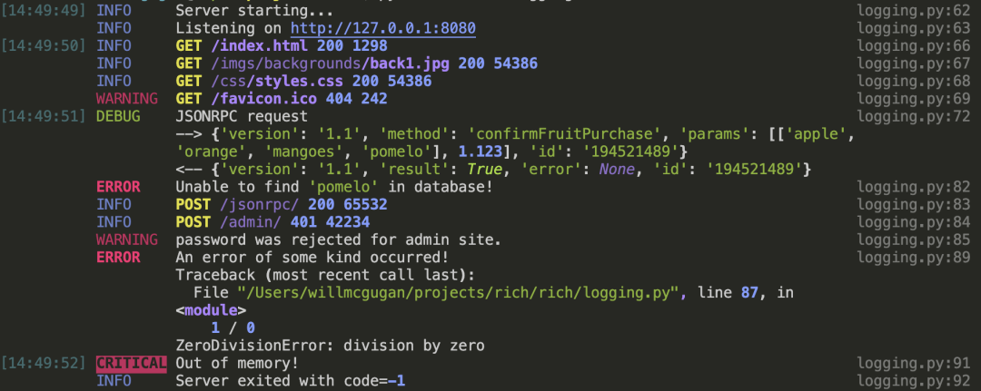 默认情况下,Rich 将针对 Python 结构和 repr 字符串进行语法突出显示。如果你记录一个集合(如字典或列表),Rich 会把它漂亮地打印出来,使其切合可用空间。下面是其中一些功能的示例: