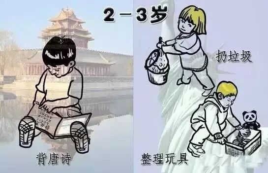 2-3岁:可以在家长的指示下把垃圾扔进垃圾箱,或当家长请求帮助时帮忙拿取东西;帮妈妈把衣服挂上衣架;使用马桶;刷牙;浇花(父母给孩子适量的水);晚上睡前整理自己的玩具。