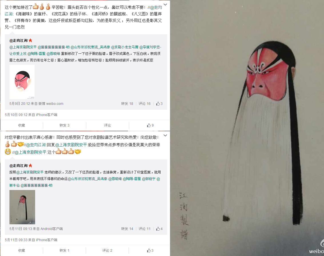 安平说,京剧演员塑造舞台形象时,一定要找准人物定位,特别是造型定位,这可以帮助演员找到人物支点。如何把伍子胥这样一个复杂人物呈现在舞台上,是一直令他苦恼的问题。《成败萧何》里的韩信是俊扮,大气、帅气,可伍子胥不能依样照搬。韩信年轻气盛,伍子胥沧桑暴戾,行当可以同为花脸,形象却要各有突破。为此,安平和服化专家共同商讨伍子胥的扮相造型,最终通过微博征求到网友的绝佳提意,定下完美方案:舍弃传统勾脸法,采用色揉结合手段,露出红色本脸,既明确行当属性,又利于情绪传递,人物的仇恨郁结在眉心上做文章,断寿眉以示其杀伐过重,不得善终,突显了人物特点。