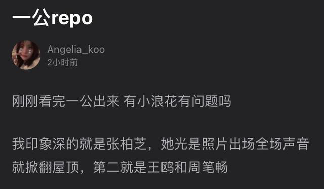 从参与一公录制的观众反馈来看,张柏芝不仅参加了《浪姐2》,一公表现也很出彩。有观众表示一公现场印象最深的就是张柏芝。据说张柏芝本尊还未出场,大荧幕上刚打出照片,现场的观众就疯狂了。好几个网友提到张柏芝都是狂赞“太美了”。“太漂亮了”!