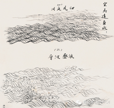 四、水:其初是勾出波纹,进而分平波、细浪、惊涛骇浪。宋马远画水画得最好,水是比较难画的,因为水是动荡不定的,要画出其动态,古人所谓五日一石,十日一水,足见其不易,切望不要草草从事。