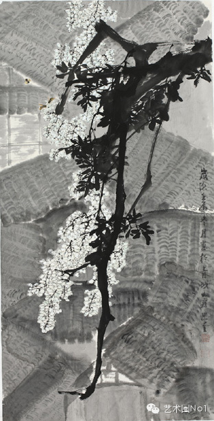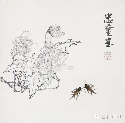 这次结集,我看他的作品,颇有感触。中国画是中国的。中国画是中国文人精神世界的表达。古人云:“画虽一艺,而气合书卷,道通心性”。笼统来说,中国画是“心性”之学。总是围绕着“美”的完善与升华而展开。以“意象”为核心要素,通过“意向”沟通“造化”。写意花鸟竟在搜妙创真,以意造型;山水人物注重“心源”、“精神”,妙在天人合一,物我相融。抽象的写意,具象的工笔,都服从于精神向往的主题。不描绘丑陋,不传达黑暗。创造意境,表达精神。钟馗丑吧?嫁妹却仁美,驱鬼亦正义。《流民图》惨吧?精神却倔强,饥寒出战争。更多的,是对客观世界美的思索和升华。如“枯藤老树昏鸦,小桥流水人家”。如“天苍苍,野茫茫,风吹草地见牛羊”。如明月松间照,清泉石上流。如“采菊东篱下,悠然见南山”等等。所有这些之表现,离不开中国画独有的线条和墨色独到精深的理解。墨分五色,黑白为要。忠奎已浸淫此道。他的《蝶恋花》以白描为底,浓枝淡叶,彩蝶纷飞,点缀花间,又装满人间,设色极大胆,是未完成之作?是有意挑拨人的视觉?留给观者颇多想象空间。《鹤寿》有点意思,传统的构图方式,大师的松叶写法,没骨而写骨的鹤之形体,是可咀嚼的成型佳作。我更看好的是读林徽因散文写意和庭院紫藤两幅。以文入画,画诠诗意。旧庭为景,花鸟传情。这是创新,是风格,风格即人格,生活育人格。忠奎本是搞建筑的,尤对古建筑颇有心得,分寸拿捏得稳,以古建筑替代传统的山石配景,他当有更多体会。你看《庭院寄情》,飞檐、花窗准确的表达了岁月沧桑。蛛网织如八卦般精准,出彩于橫斜梅枝,只几点花朵便见生机。诗的婉约,意的洁净,那个新旧对比的情形,那个迷茫惆怅的心境,让人神思邈远。还得提到天柱老师,中国花鸟画独树一帜的擎旗人。用哲人的智慧赐花鸟生命以空灵。以小喻大以少胜多的简洁笔触,表现了现代花鸟的灵魂。不教学生似我,督导弟子出而有格,不容易。