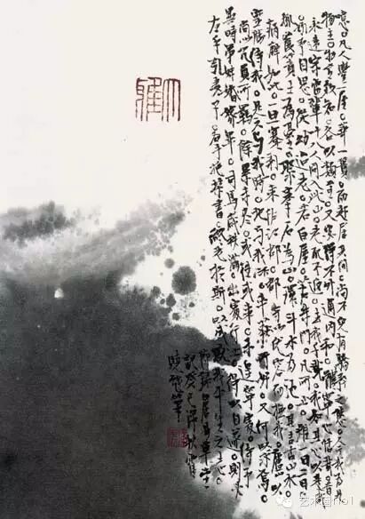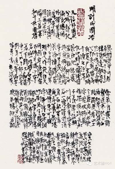 我探索寻找着小楷书法中与传统和现代绘画相契合的因素。我尝试着将这些书法小字视为绘画中的点与线,视为作品构成的视觉符号或造型符号,去完成熔诗书画于一炉的另类山水写画,或者是另类语言风景,获得在视觉层面的新的传播及沟通功能。在这里,人们首先欣赏的图像,是谋篇布局,然后才是文字所承载的内容。