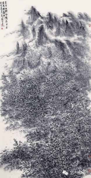 我们看茂森的山水作品,他很讲究笔墨,但又不拘泥于笔墨。在他的胸壑中,有中国画这个大的框架,但又不囿于传统法度的束缚。他的作品,勾、皴 、点、染,一招一式都很有章法。在细节上,比如在黑白、疏密关系上的处理上也一丝不苟。但在总体造型和布局上,他又大胆于近乎出奇,他充分自由的调动着手中的纸、砚、笔、墨的大军,进行着别出心裁的排列组合。这样,他的作品总体上看就非常有张力,有撼人心魄的效果。他用很传统的笔法,画出了非常具有时代效果的作品,他的画有现代的美感。从某种程度上讲,也起到了丰富中国画的绘画语言的效果。