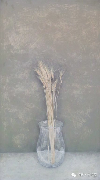 以此静物画背景观之,罗徕的这批静物画显然有观念上的根本性区别。显然,这批静物画不以再现物质对象为其旨归。画家在这种静物画上有意弱化色彩与光影,而把整个画面统一在灰色调中,仅在灰色中作有限制的光影体积的刻划,色彩也因减弱其色相与色度而向灰色靠拢,从而呈现出静物化色彩的非常主观化的独特处理。画家何以减弱视觉感受的丰富性而朝单纯性方向发展?这种弱化形体体积感的做法,当然也就弱化了视觉的深度感和事物的真实感,弱化了西方静物力图创造的真实幻觉感而朝平面的虚拟的绘画特征上发展,亦即我们看罗徕的绘画时,我们只是在看画不再产生乱真的视幻觉。再朝其造型特征上看,画家对这种单纯性的追求显然有相当的自觉。他的几乎所有的静物,取材也单纯。与西方静物画或我们美术学院静物画课程那种物品繁复堆积完全不一样,罗徕静物画取材单纯,每幅作品或一瓶花,或一盘果子,或一两朵莲蓬,或一个古董瓶子,或一张明清古典椅子,而且所有这些物件,都无例外地端端正正地置放在画面正中,或切放在刚好二分之一的画面。这些带有强烈规范性的处理也大不同于常规绘画要求要求打破对称,要求多样统一的样式。画面之形式感因此显得单纯而宁静。如果我们再仔细观察画家的取材,画面几乎都取自中国传统文化色彩浓厚的青花瓷,古代几案、椅子,古青铜器,古陶瓶,甚至有五千多年前马家窑的彩陶瓶!所有的这些物象,其实都如一个个中国文化的符号,指向深邃幽远的中国文化历史的时空。显然,画家在追求文化的古厚、典雅、幽深乃至神秘。