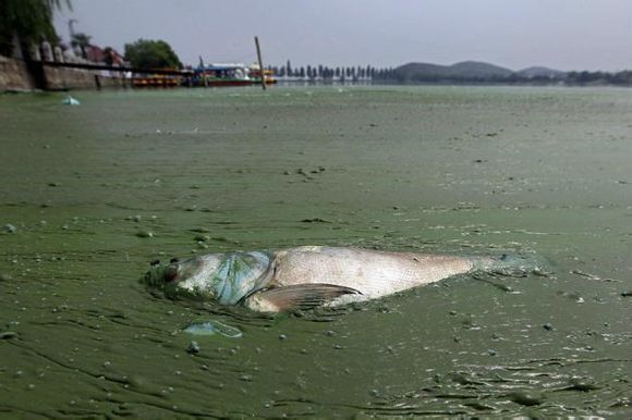2012年8月20日,湖北省武汉东湖里泛滥的蓝藻及漂浮的死鱼。