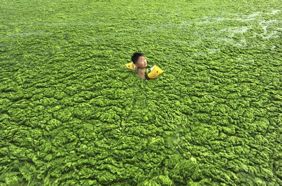2007年8月16日,北京,一名男子在被藻类萌生污染的水渠里游泳。