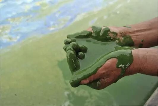 2009年6月16日,一位渔民从安徽合肥巢湖里捧出充满藻类的水。