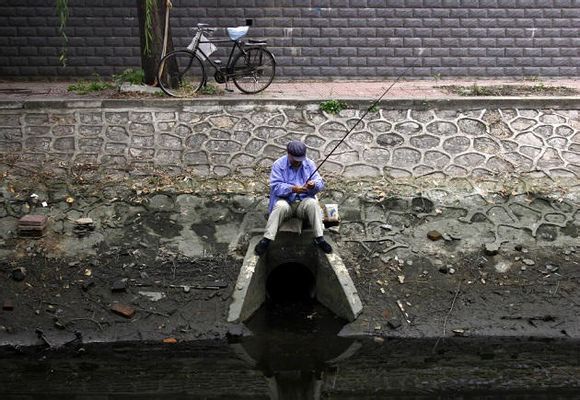 北京中部一条受污染的小水渠,一个人在垂钓。