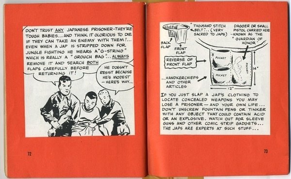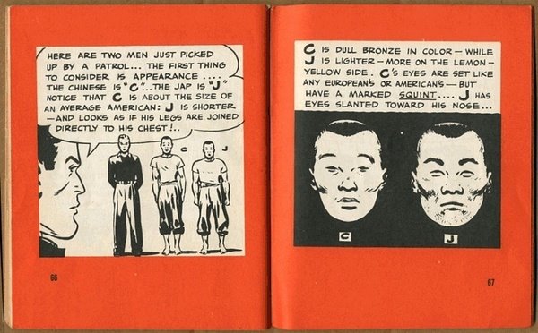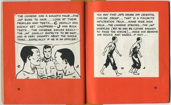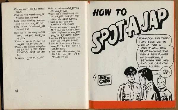 这本小册子有75页,漫画家Milton Caniff以幽默搞笑的方式图解中国人与日本人的特征和区别。在书的扉页,一位美军军官向大兵瑞恩发问:“嘿,瑞恩,你在中国待了那么长时间刚回来,和我们说说日本人长得和我们的东方同盟军有什么不一样吧!”