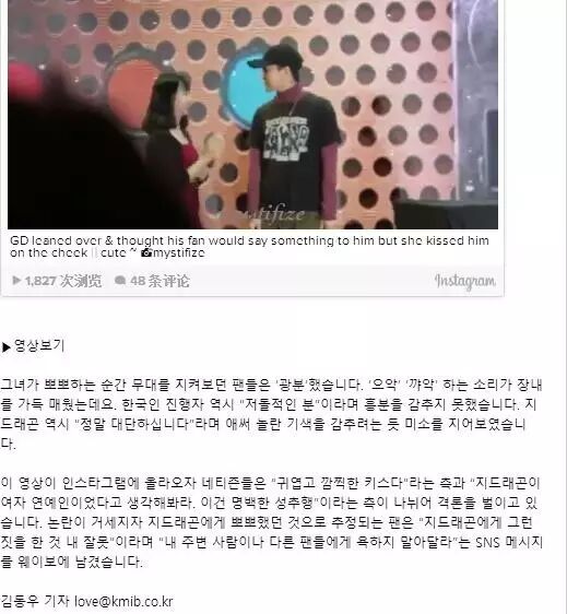 在这则名为“权志龙被亲,如果GD是女生,可否算性骚扰”的文章中,作者称影像在韩国流出后,网友们有的觉得权志龙的反应很可爱,有的认为他遭遇了性骚扰,还有人脑洞大开说其实那个女粉丝是权志龙的女朋友。