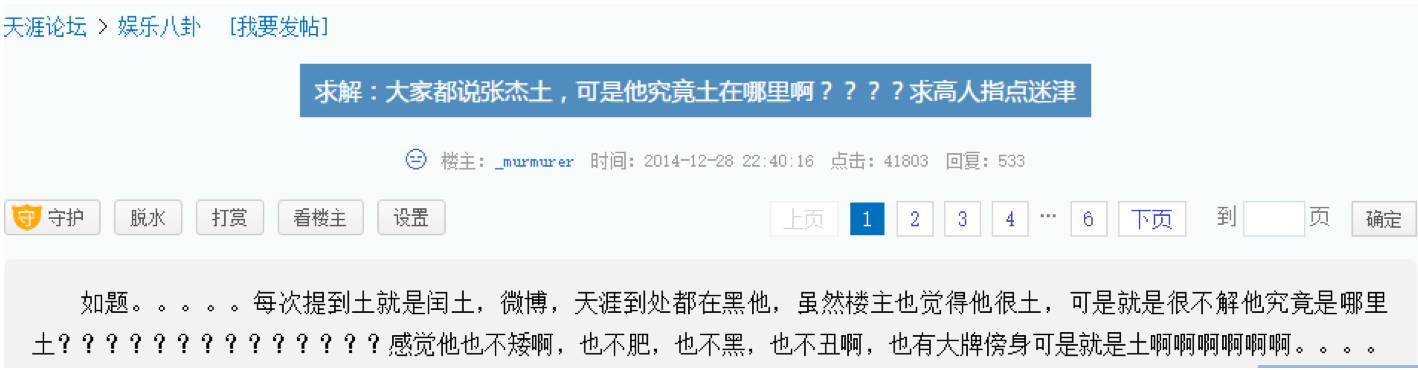 在天涯上,娱乐八卦版其中一条关于张杰究竟土在哪里的帖子,有500多条回复。