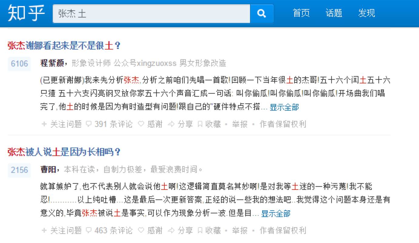 去年,有一篇文章《在知乎被狂赞的文章为何会在今日头条被骂得要死?》在新媒体运营圈广受讨论。在文中作者说,现在在知乎上可能被疯狂点赞的文章,在今日头条阅读量可能不会超过1500;今天在天涯、豆瓣上网友热衷支持的观点,在知乎上可能被狂喷。但关于张杰“土”这一点,各大平台罕见的达成了一致。