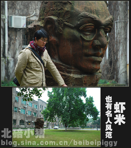 楼房前的几块草坪上,全是这样的大头。好像是美术系的学生作品。有美术系的高校就是好,校内环境美化都能自产自销,肥水不流外人田,还省钱。