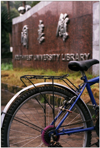多么坚韧不拔的自行车啊!不知它在图书馆门口屹立了多久,还要等待多久,才会有人打开车锁带走它——希望不是小偷。这种事情放在我的大学是不可想象的,哪怕是破车都有贼盯着,不要说一辆成色还不错的车,独自停在光天化日之下,一转身就会没影儿的。