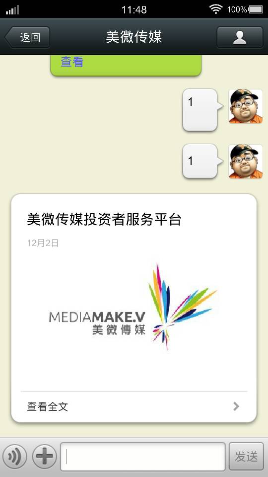 使用美微传媒微信公众平台,首先需要人工触发,您可以关注我们后,在消息框里输入0~9之间任何一个数字,也可以输入“美微传媒”、“芝麻开门”、“boss”等词,发送后会收到一个返回结果。如下图。
