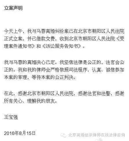 然而8月14日凌晨,宝宝(王宝强)突然曝出离婚声明,表示因妻子马蓉与纪经人宋喆有不正当两性关系,严重伤害夫妻感情,因此将提起离婚诉求。声明一出,犹如一枚重磅炸弹,一时间新闻头条均被攻占。