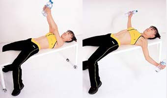 1.平躺于长方凳上,徒手或拿哑铃,亦可用矿泉水瓶代替