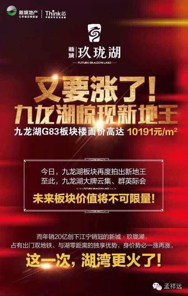 也如此前一样,每一个新地王出炉,都会引起开发商尤其是周边项目的强烈关注。这次新城地产也在第一时间出了海报,称“九龙湖惊现新地王,又要涨价了”,好吧~~确实,之前14000-16000买精装九龙湖的同学们,还是买的划算的。今天就有微友在买家讲坛QQ群里交流(群号248508678),才以16000的价格买进保利中央公园,说感觉赚到了。