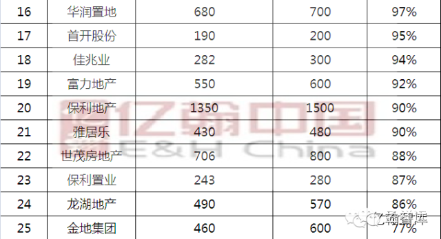 统计25家企业中,14家完成全年业绩目标,绿城在业绩与目标都剥离融绿之后,以118%的业绩完成率排在第一,恒大次之。万科、蓝光、远洋、中海、华夏幸福以及碧桂园也如期顺利完成年度业绩目标,完成率超过100%;除了绿地外,其他完成全年业绩目标的企业还有融创、招商、合景泰富、新城控股、旭辉以及方兴地产。