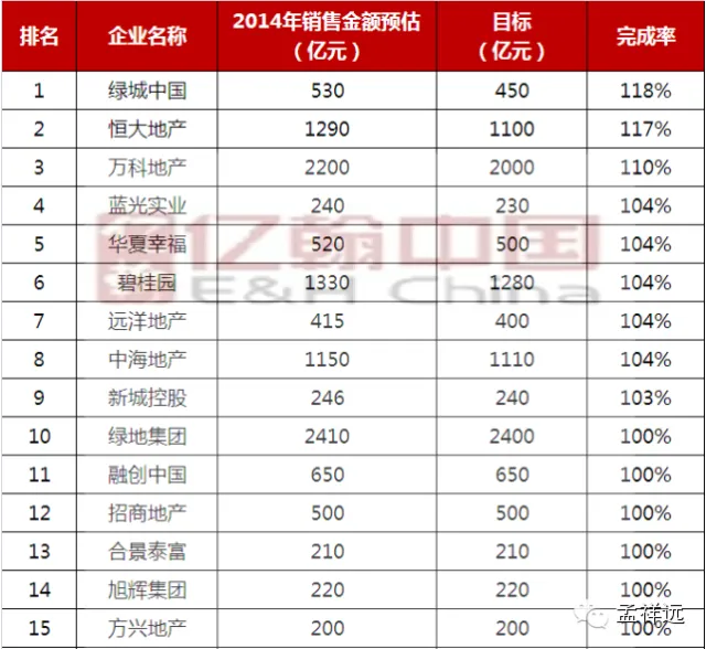 整体来看,房企销售前50强门槛由2013年100亿提升至140亿,2014年虽然整体市场进入调整期,但是中央与地方政府大力救市,使得行业没有出现大幅下滑,多数房企全年业绩同比增加。