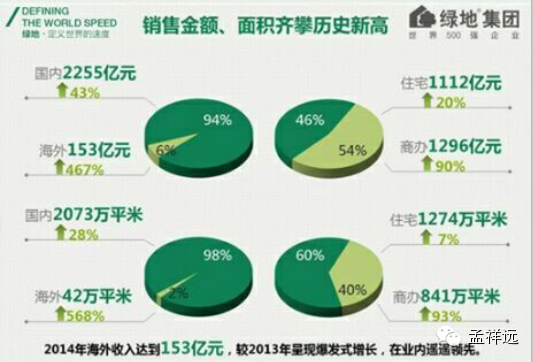 3、绿地今年快速的增长很大程度上得益于海外战略。近两年,绿地耗资近900亿元在9个国家投资了10多个海外房地产项目。据绿地集团董事长张玉良表示,海外收入到2020年占公司总收入超过四分之一。