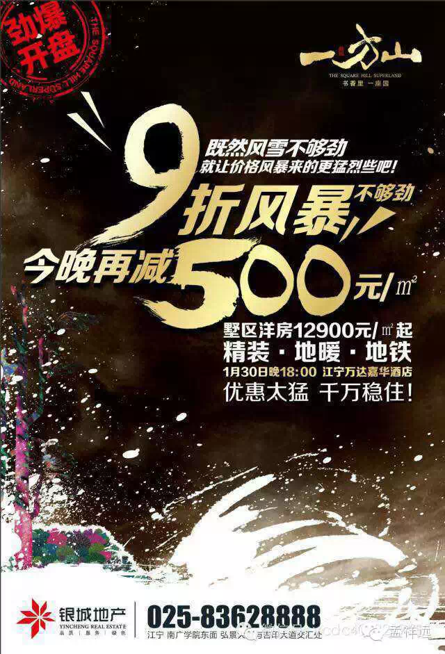 今日,一方山劲爆开盘,喊出"既然风雪不够劲,就让价格风暴来的更猛烈些吧"。这是要闹哪样?其海报打出“九折风暴不够劲,今晚再减500元/㎡”。不仅有九折优惠,在这一基础上每平方米价格会再减五百元。这个优惠是有点猛,要稳住。此次推出的墅区洋房12900元/平米 起,以精装、地暖、地铁三大优势冬日来袭。http://mmbiz.qpic.cn/mmbiz/Wuerr0OnLdFYOwJELczBhrLCuGqUWSLrxTFvGdlBLwKr1AKdUUrQAWI2ewq7dVscgJt7ytee9nzlO88JtBX80A/640?tp=webp