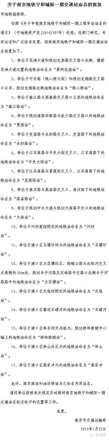 据江苏省南京市交通运输局官方微博通报,地铁宁和城际一期的十九个站名最终确定,批复原文如下图。