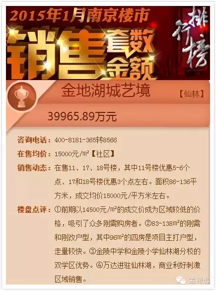2015年已经进入2月,过去的1月份的南京楼市虽然没能像2014年12月份销售的那样火热,但是纵观2015年1月南京楼市销售排行榜,依然颇有看点。值得一提的是,1月份南京楼市的冠亚军都出现在不大的仙林湖板块,新城香悦澜山凭借首开热销400套夺取销冠,但金地湖城艺境在持销期仍能取得单月销售4亿的好成绩也让人颇为惊奇,值得关注: