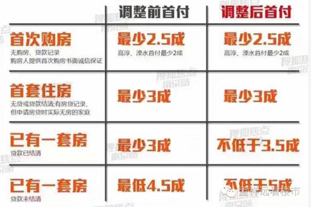 首套房仍按前期政策首付25%(高淳、溧水20%)不变;对拥有1套住房且相应购房贷款已结清的居民家庭最低首付款比例调整为不低于35%(除高淳、溧水);对拥有1套住房且相应购房贷款未结清的居民家庭最低首付款比例调整为不低于50%(除高淳、溧水)。