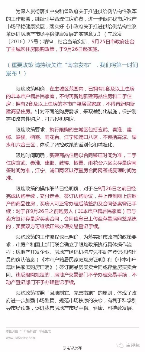首先,南京的限购是可预判的!在一线城市收紧,热点二线城市也调控的大背景下,南京的调控缩紧是大势所趋,南京也有不少风向体现出来调控的可能。9月23号出台了户籍新政,后又出台了税收调整政策。昨天也收到了风声说将出台较严厉的限购政策,都是一些明显的信号,不可不察。(昨天我也收到南京将出台实质性限购的消息,发在了实名微博上进行了提示)