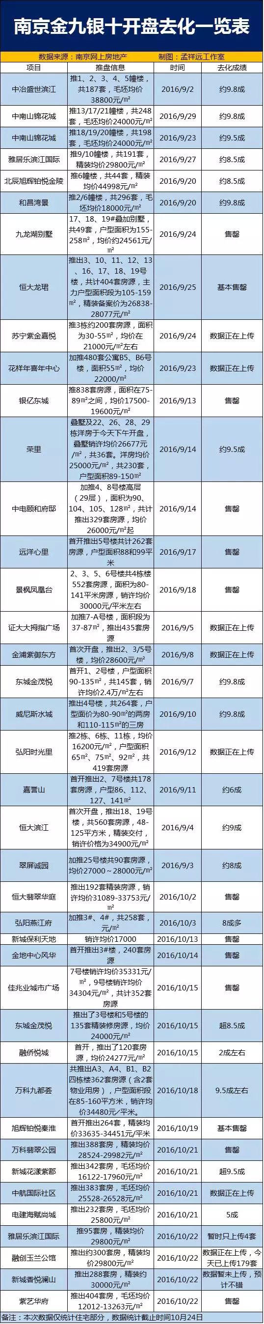 那么,今年金九银十期间,开发商是否如期挣得盆满钵满?各项目开盘去化成绩如何呢?下面是孟祥远工作室对南京楼市9、10两月的开盘统计,去化数据取自官方发布的南京网上房地产,客观真实,下面我们就将鲜活的数据分享给大家,并附孟祥远 独家解读!