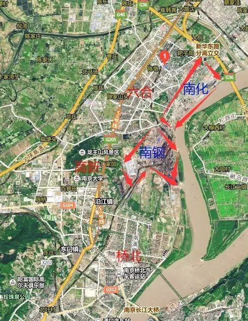 下面这张图是桥北、高新、六合以及南钢、南化、扬子石化(南化上方位置)三大厂的布局图。