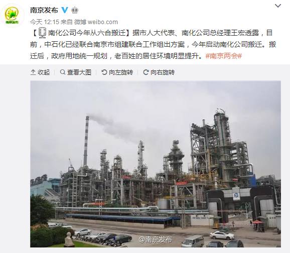 据人大代表、南化公司总经理王宏透露,目前,中石化已经联合南京市组建联合工作组方案,今年启动南化公司搬迁。搬迁后,政府用地统一规划,老百姓的居住环境明显提升。