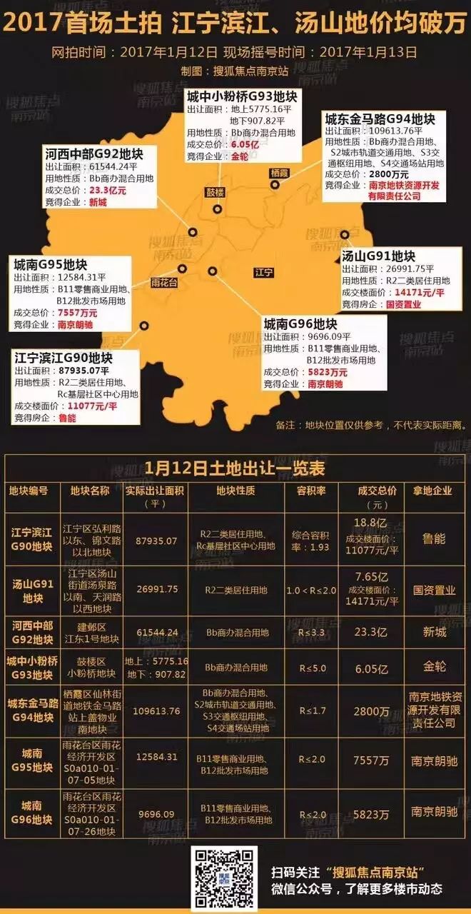 NO.2016G91(江宁区汤山街道汤泉路以南、天润路以西地块)5家企业经现场摇号由南京国资新城投资置业有限责任公司竞得,起始价3.6亿元,成交总价7.65亿元。