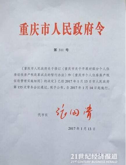 鉴于此,市政府决定修订2011年施行的《重庆市关于开展对部分个人住房征收房产税改革试点的暂行办法》和《重庆市个人住房房产税征收管理实施细则》(重庆市人民政府令第247号),将“征收对象”中的“在重庆市同时无户籍、无企业、无工作的个人新购的第二套(含第二套)以上的普通住房”调整为“在重庆市同时无户籍、无企业、无工作的个人新购的首套及以上的普通住房”。调整后的个人住房房产税政策以重庆市人民政府令第311号公布,自2017年1月14日起施行。