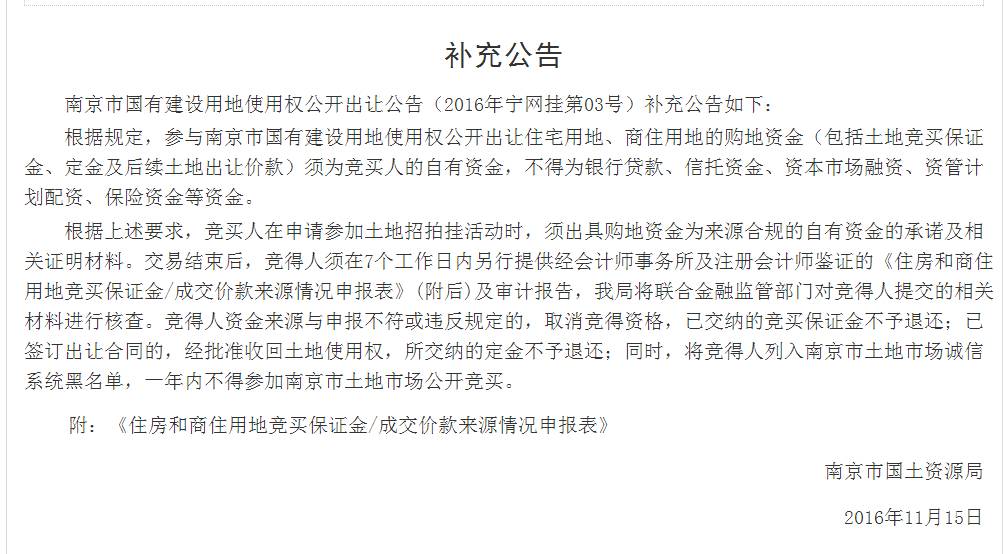 孟教授表示,对南京的开发商来说,这样的政策并不陌生。去年11月15日,南京国土局出台新政,明确规定房企购地资金须为自由资金,不得为银行贷款、信托资金等资金,竞得人资金来源与申报不符或违反规定的,将取消竞得资格等规定。