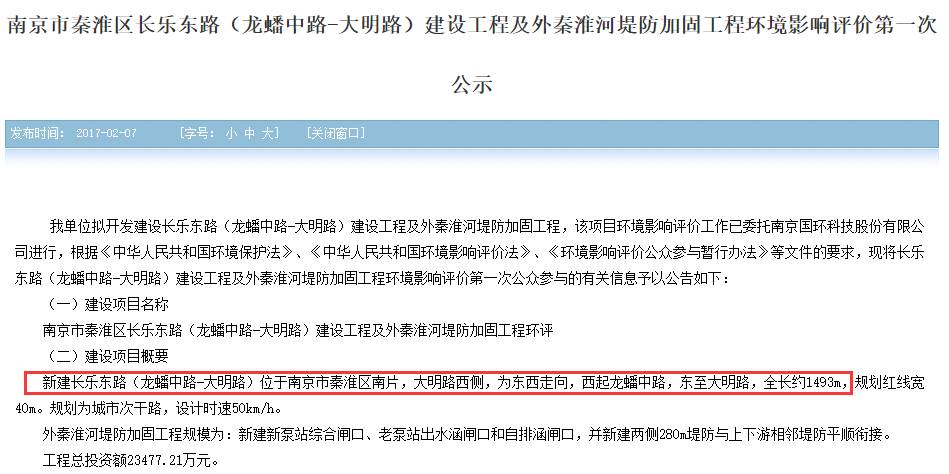 此外,南京市秦淮区长乐东路(龙蟠中路-大明路)建设工程及外秦淮河堤防加固工程环境影响评价第一次公示。