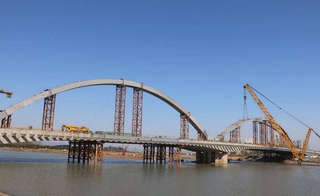 日前,中兴路北延跨秦淮新河大桥工程桥梁段已全桥合龙,目前正在进行钢拱结构及挑梁吊装施工。