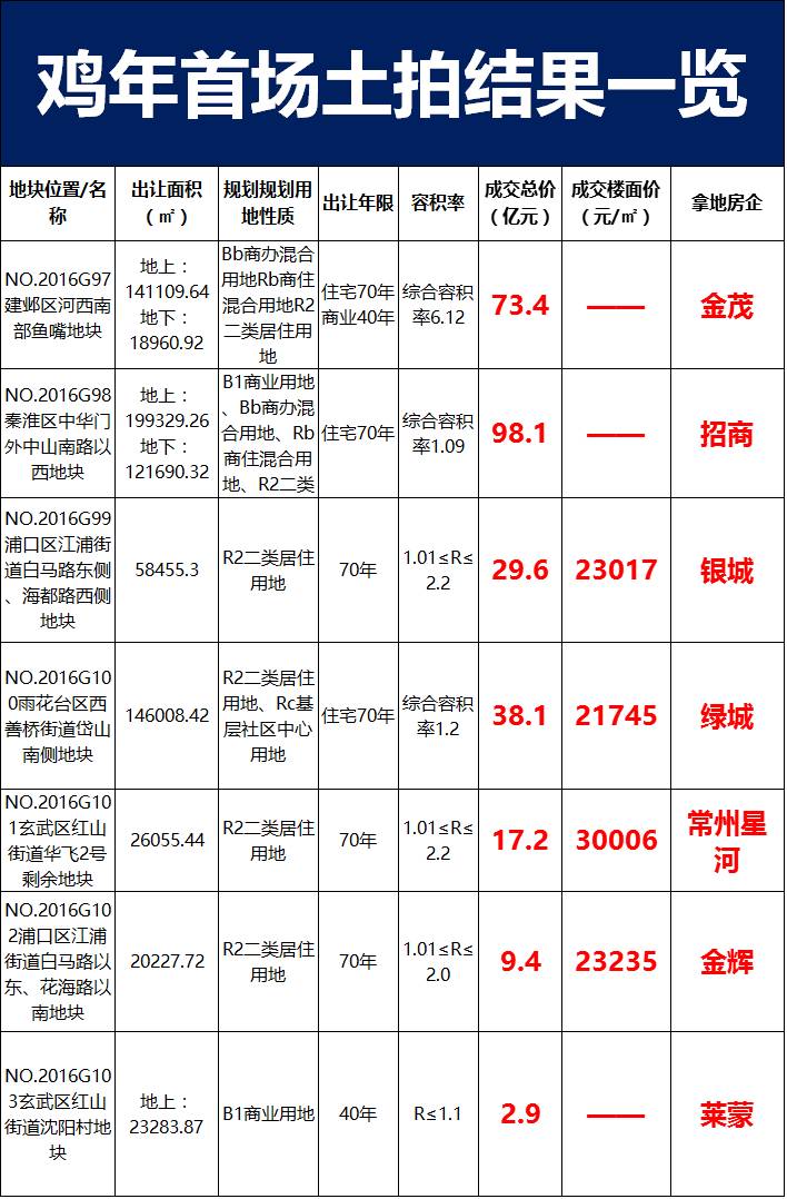 1、今天南京鸡年首场土拍摇号结果公示,城北地价破3万,江北新诞生2幅2万 地块;