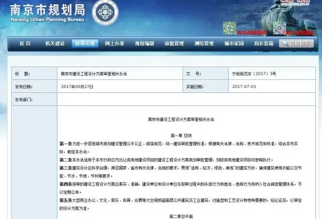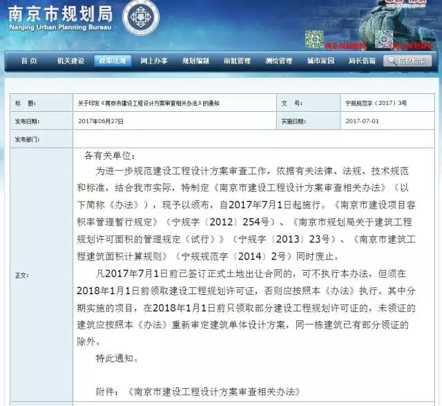 昨天上午,南京官方回复:凡2017年7月1日前已签订正式土地出让合同的,可不执行本办法,但须在2018年1月1日前领取建设工程规划许可证,否则应按照本《办法》执行。其中分期实施的项目,在2018年1月1日前只领取部分建设工程规划许可证的,未领证的建筑应按照本《办法》重新审定建筑单体设计方案,同一栋建筑已有部分领证的除外。