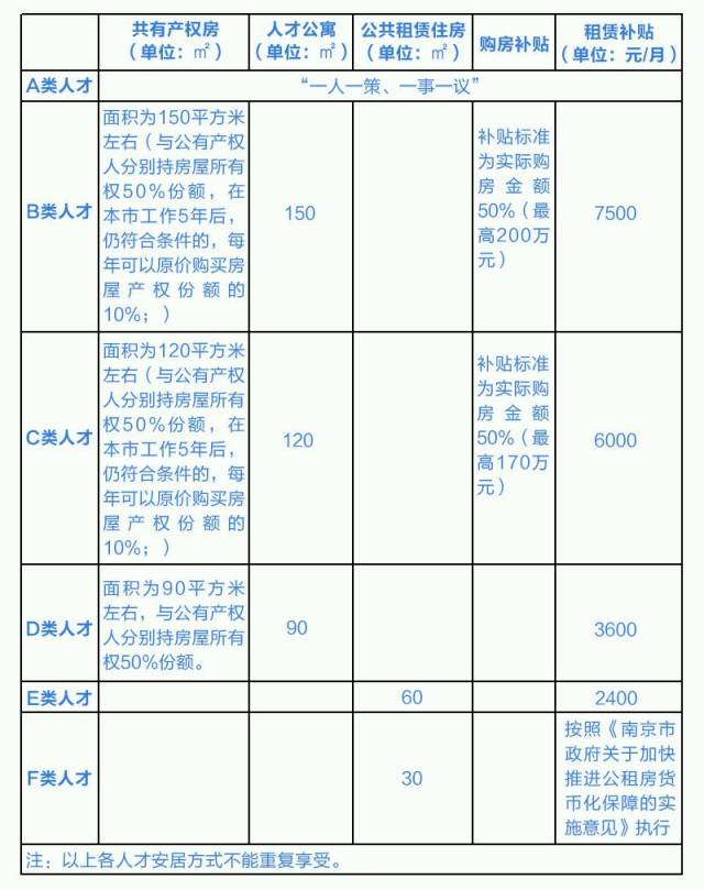 根据新规,目前南京人才安居方式有共有产权房、人才公寓、公共租赁住房和购房补贴、租赁补贴五种安居方式:首年原则上以租赁补贴为主;其后,人才可根据自身需要和政府提供的安居方式,自主选择实物安置或货币补贴。
