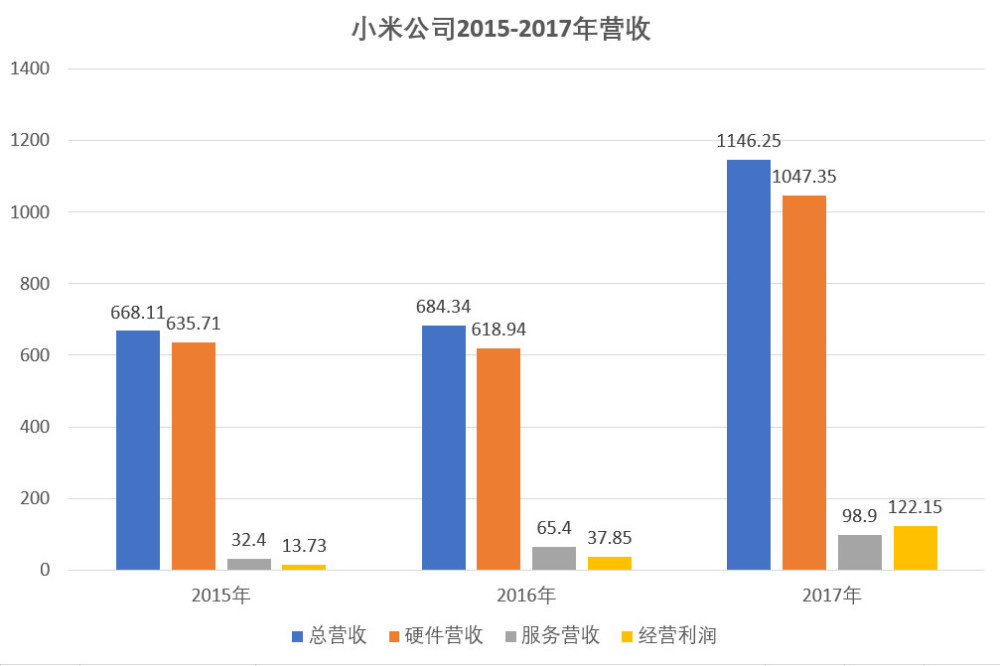 2017年,小米总营收1146.25亿元,经营利润为122.15亿元,经营利润率为10%。其中,来自互联网服务的营收为98.9亿元,占总营收的8.62%,硬件应营收占比大概为91%。