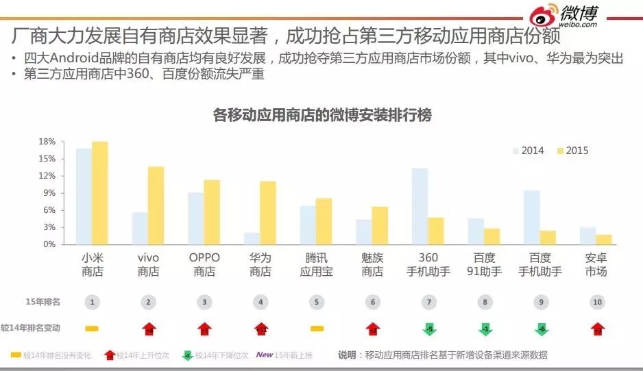 手机渠道的分析结果是如何得出的?据从微博方面了解,设备渠道来源是指新增设备的微博客户端联网激活渠道,主要包含厂商移动应用商店、厂商预装、第三方移动应用商店、运营商定制机。