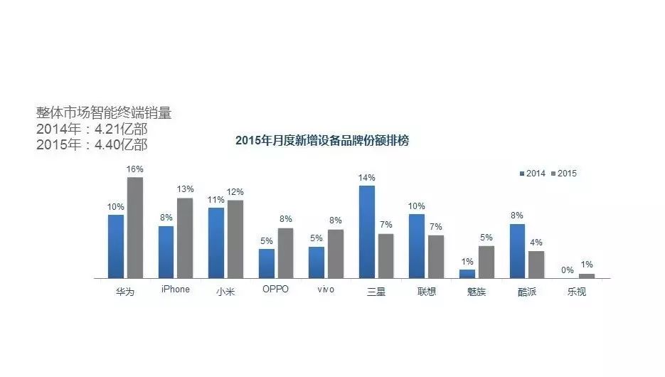 国产手机异军突起,苹果、三星份额下降,除了这一趋势之外,从这次报告中还能看到一个明显趋势,就是Android手机品牌集中度持续加强,活跃的存量设备中,小米、华为、vivo、OPPO四大国产Android品牌占据Android市场59%的份额(2014年为47%),且该四大品牌在新增设备中的份额也在持续提升(14年29% vs. 15年43%),预示Android手机市场集中度还将持续加强。